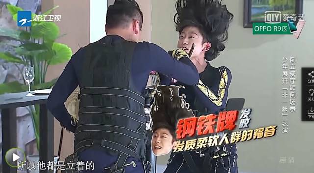 首胜告捷,少年们又遇到了第二项高能挑战——“倒立餐厅”,在这里几位少年需要两两一组在倒吊的情况下完成表演,这对体力和脑力都是不小的考验。张一山和王大陆作为第一组选手进行挑战,因为需要扮演情侣,张一山毅然戴上了假发,还自我调侃“还挺美的”,然而在倒立的过程中帽子掉落,假发“上垂”,造型堪称“辣眼睛”,全场一片爆笑。