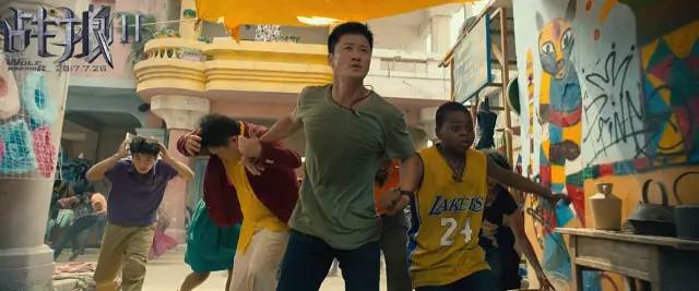 在这之后的动作戏,有时穿梭在非洲城市的闹市中,有时依附于卡车等移动的交通工具,在工厂、超市、棚户区等千差万别的环境中变化。例如片中有一场贫民窟飞车狂飙的场景,吴京单臂挂在飞车上,从贫民窟的环境中弛过。
