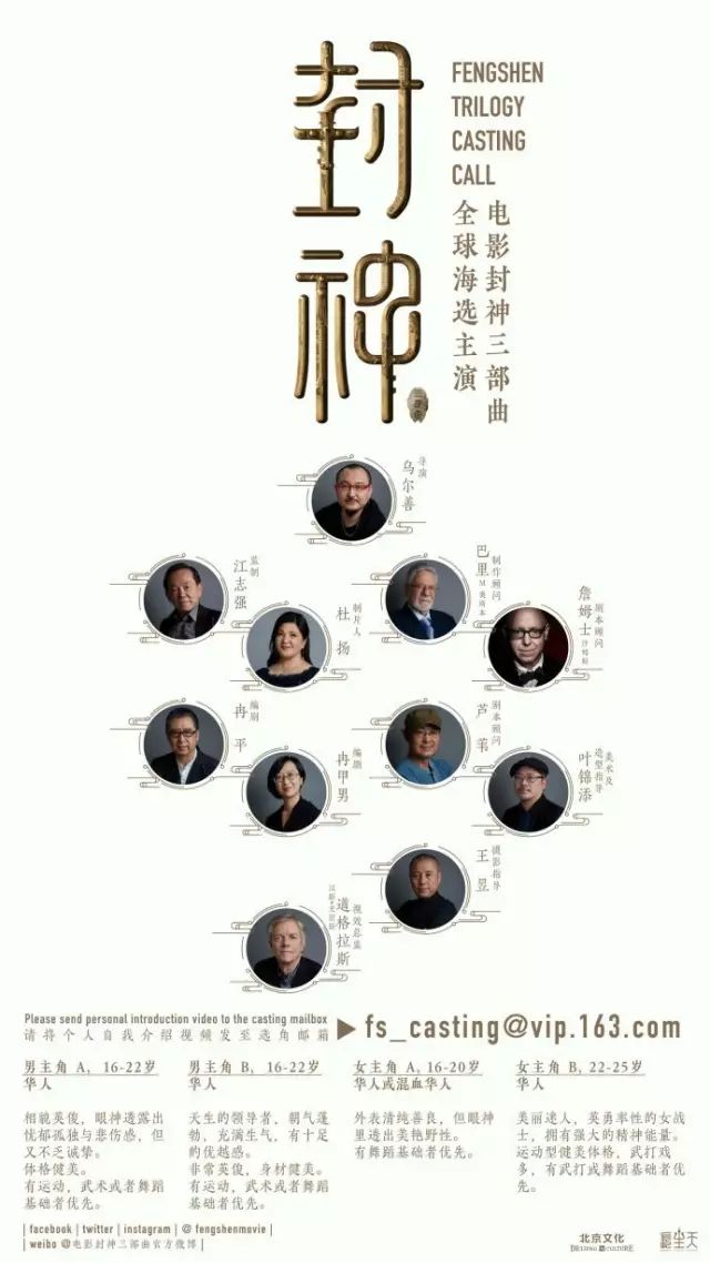 表演指导刘天池老师表示,虽然这并非第一次参与演员招募,但以国际化方式海选演员的标准来选拔、训练演员尚属首次。“《封神三部曲》国际化的制作水准注定需要的是能与角色气质融为一体的年轻演员,这也是乌尔善对于这部东方奇幻史诗钜制的坚持”。