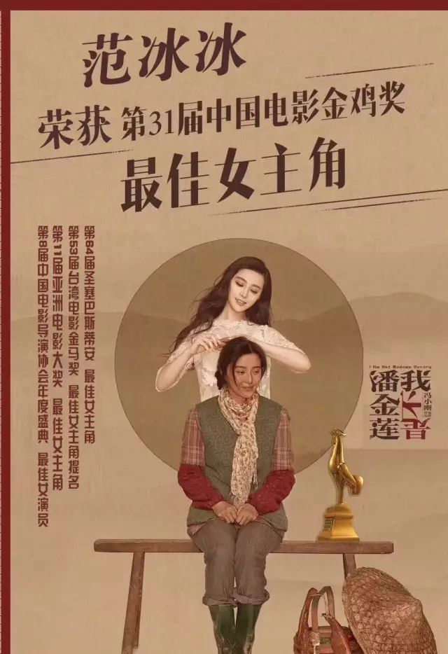《我不是潘金莲》是范冰冰继《手机》后12年来第二次与冯小刚导演合作,她在影片中饰演的村妇李雪莲,其出色的表演和突破性的造型均呈现出了范冰冰不同以往的另一面,从而赢得了第64届西班牙圣塞巴斯蒂安国际电影节最佳女主角、第11届亚洲电影大奖最佳女主角、第8届中国电影导演协会年度女演员,以及第53届台湾电影金马奖最佳女主角提名等多项殊荣。此番斩获第31届中国电影金鸡奖最佳女主角,无疑也是对范冰冰在电影中的出色表现给予了再一次的肯定和赞赏。