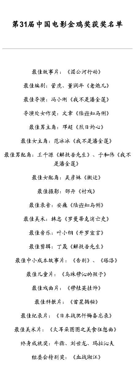第三十一届中国电影金鸡奖完整获奖名单: