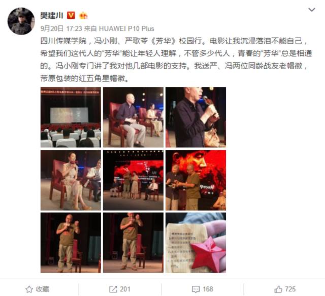 在北大,不少年轻观众表示《芳华》引发了他们对青春的强烈共鸣,有几位学生甚至难掩激动数度哽咽:“历史不容忘记,向英雄致敬!”成都站,建川博物馆馆长樊建川在观影后几度哽咽,并向冯小刚和严歌苓赠送了当年佩戴的军帽帽徽,事后发微博称“电影让我沉浸落泪不能自己,希望我们这代人的“芳华”能让年轻人理解,不管多少代人,青春的“芳华”总是相通的。”而今日《芳华》在华南理工大学点映,现场同样座无虚席,备受期待。