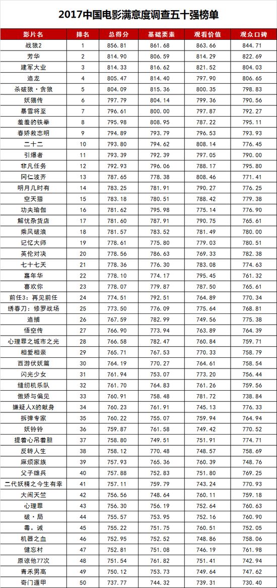 在早先放出的中国电影满意度50强名单中,拿下中国电影票房榜冠军的《战狼2》毫无悬念高居榜首,《芳华》紧随其后拿下第二。该排名通过“基础要素”、“观看价值”、“观众口碑”三个纬度的调研,对媒体评委在2017年度中国电影库中投票评选出的五十部作品进行排名从而得出结果,《战狼2》和《芳华》能够位列一二,既是对影片质量的肯定,也代表了广大观众和媒体的认可。
