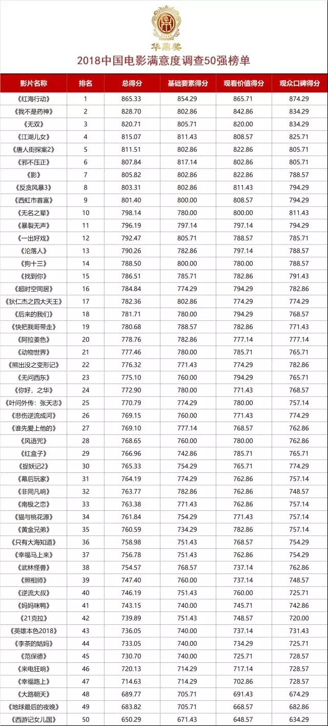 2018中国电影满意度调查50强榜单